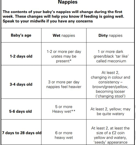 Table with information for parents regarding nappies in a new-born baby, from