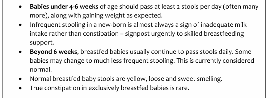 intake rather than constipation – signpost urgently to skilled breastfeeding