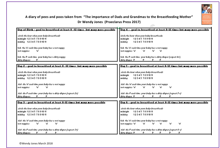 During my presentation to LLL Ireland I was asked where was it possible to obtain a copy of the pee and poo chart I mentioned. This is from my book The importance of Dads and Grandmas to the Breastfeeding Mum. Hope it helps Mums, Dads and Grandparents keep track of adequate breastfeeds and output to ensure the baby is getting enough milk.